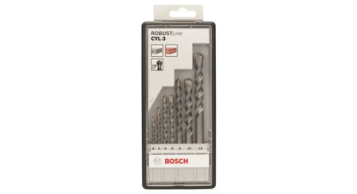 7-delige Bosch Robust Line Silver Percussion betonborenset CYL-3. Geschikt voor boorgaten in beton, metselwerk, kalkzandsteen, natuur- en kunststeen.