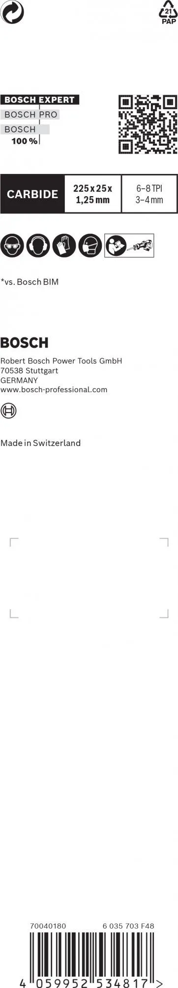 Een echte oplossing voor zaagbladen die simpelweg niet lang meegaan op de moderne werkplek: het Bosch Expert ‘Multi Material’ reciprozaagblad is een betrouwbare partner die meer zaagt dan alleen metaal en hout. Kunststoffen, bouwcomposieten en prefabelementen die op bouwplaatsen worden gebruikt, zaag je allemaal betrouwbaar dankzij Bosch Carbide Technology. De progressieve tandafstand is ontworpen om zowel dunne als dikke materialen te zagen.